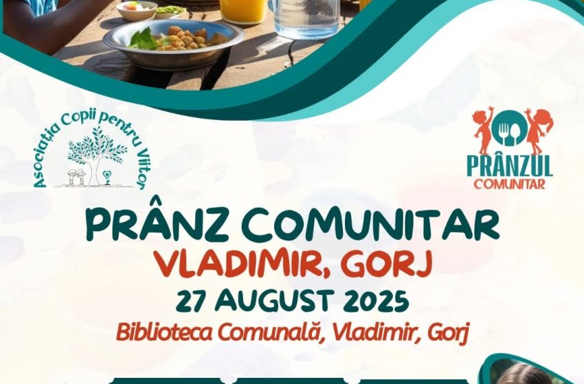 Vladimir, județul Gorj – 27 august 2025, ora 11:00 – Cornelia Cucuruz, din partea Asociației Copii pentru Viitor, în calitate de organizator, împreună cu Anișoara Bocai, din partea Asociației pentru Dezvoltare Comunitară Vladimir și Bibliotecii Comunale Vladimir, ca partener, alături de Metropolitan Life, partener strategic al programului „Prânzul Comunitar”, vă invită la un nou eveniment din seria „Prânzul Comunitar”, un program național de activare comunitară care aduce împreună generații și creează punți de solidaritate între oameni.
